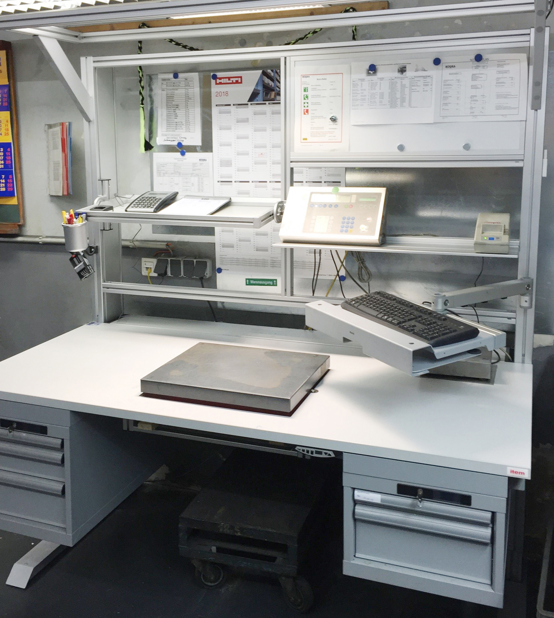 Das Ergebnis besteht aus einem elektrisch höhenverstellbaren Tischgestell mit einer Arbeitsplatte, in der die Waagen eingelassen sind. Dies ermöglicht dem betroffenen Mitarbeiter, die Waren in einer bequemen Haltung anzunehmen und auf dem Tisch zu verschieben – und das ohne eine größere Kraftanstrengung. Zudem hat er nun die Option, je nach Bedarf im Stehen oder Sitzen zu arbeiten. Komfortable Greifwege und eine zeitgemäße Medienversorgung werden durch zwei Schubladenschränke, ein Tablett mit Winkelfeststellung, eine Kabelwanne und einen Tastaturarm sichergestellt. Darüber hinaus konnten auch zusätzliche Gerätschaften, wie beispielsweise ein Etikettendrucker, optimal im reduzierten Greifraum des Mitarbeiters platziert werden.